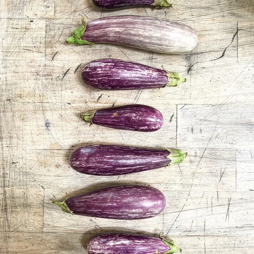These are fairytale eggplants and if you can find them at your local farmers market, you MUST try them. They are small (no bigger than my hand), have a delicate, non-bitter flavor and cook to a perfectly creamy texture.